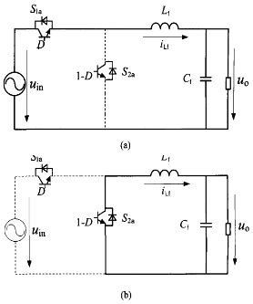 當開關管S1a開通、S2a關斷時,輸入電壓通過開關管S1a的反向二極管、電感Lf給電容Cf和負載供電,如圖3(a)所示;當開關管S1a斷開,S2a開通時,電感電流iLf經Lf、開關管S2a、Cf和負載續流,Lf和Cf共同向負載供電,如圖3(b)所示。
