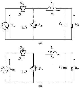 當開關管S1b開通、S2b關斷時,輸入電壓通過開關管S1b、電感Lf給電容Cf和負載供電,如圖4(a)所示;當開關管S1b斷開,S2b開通時,電感電流iLf經Lf、開關管S2b的反向二極管、Cf和負載續流,Lf和Cf共同向負載供電,如圖4(b)所示。