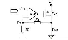 間接閉環(huán)控制環(huán)路如圖1所示,該控制環(huán)路包括一個誤差放大器,反饋環(huán)路和調(diào)整管(VMP管)。工作原理是由誤差放大器將輸出反饋電壓VFB與參考電壓Vref進行比較,并放大其差值(Vref-VFB)以此來控制調(diào)整管(VMP)的導(dǎo)通狀態(tài),實現(xiàn)負(fù)反饋,從而得到穩(wěn)定的輸出Vcon。電路剛啟動時,反饋電壓VFB很低,如果穩(wěn)壓器啟動時產(chǎn)生較大的電容(或者負(fù)載電容很大)或VMP管導(dǎo)通時有較小的電阻,浪涌電流(即流過VMP管的瞬間電流)就會很大,有時會接近穩(wěn)壓器的電流限值。因此,必須在誤差放大器中設(shè)計軟啟動電路,以保證整個電路在上電后進入正常的直流偏置狀態(tài),不會產(chǎn)生浪涌電流。