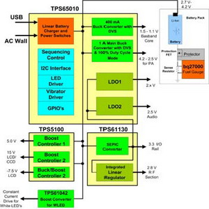 在此解決方案中,3.3V I/O 電源是由SEPIC 轉換器提供,它讓應用系統能充份利用鋰離子電池電力,直到電池電壓降至最低水平(大約2.7V)。和離散解決方案一樣,穩壓器輸出也來自3.3V 輸入電源,以便提高工作效率。TPS65010 采用48 只接腳QFN 封裝,這些組件都內建FET 晶體管。TPS61130 SEPIC 轉換器采用4×4 平方厘米QFN 封裝,并且內建FET 晶體管,最高達到90%以上效率,TPS5100 則是三通道輸出控制器,專門用來提供電源給顯示器。功率放大器和中央處理器電源使用的動態電壓調整技術可以改善每顆零件的效率,進而協助降低功耗。