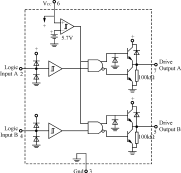 MC34152的外圍電路簡單,應用方便。它是8管腳的同相推挽驅動芯片,具體的內部結構和封裝如圖4所示。腳2與腳4為兩路控制信號輸入,經過芯片內部的推挽放大,直接輸出同相的兩路驅動信號(腳7及腳5)。為使芯片更加穩定地工作,一般在芯片的電源端并聯一個濾去高頻干擾的瓷片電容和一個濾去低頻干擾的電解電容。