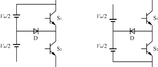 文獻[2]分析了三電平DC/DC變換器的推導過程:用兩只開關管串聯代替一只開關管以降低電壓應力,并引入一只箝位二極管和箝位電壓源(它被均分為兩個相等的電壓源)確保兩只開關管電壓應力均衡。電路中開關管的位置不同,其箝位電壓源與箝位二極管的接法也不同。文中提取出兩個三電平開關單元如下圖1所示。圖1(a)中,箝位二極管的陽極與箝位電壓源的中點相連,稱之為陽極單元;圖1(b)中,箝位二極管的陰極與箝位電壓源的中點相連,稱之為陰極單元。