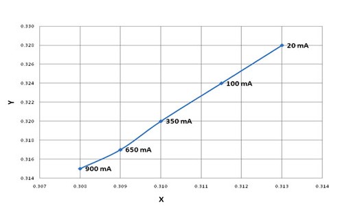 使用減小電流的方法進行LED調光類似于大多數白熾燈泡使用的調光方法。這種減小電流的方法在為數不多的應用中可以接受,但隨著光等級降低,LED發出的光色彩也根據電流而變化。電流較小時,色度(Chromaticity)朝向黃色變化。圖1顯示不同電流時的典型色度變化。