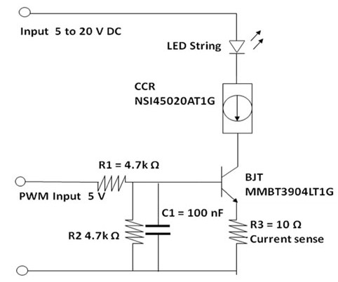 采用簡單的CCR及雙極結晶體管和PWM訊號控制的LED能夠輕易地調光至汽車及建筑物照明應用要求的精度。使用雙極結晶體管使LED能夠以恒定電流驅動,從而不會有色度變化;光的色彩仍然保持一致,僅是LED發射的光量減小。