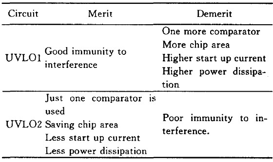 電路的工作原理可簡述如下:12 V供電電壓可在VDD比較低時建立一個PTAT (ProportiONal toabsolute temperature)電流源,然后利用其建立起帶隙基準電壓源;當VDD由0上升時,帶隙基準電壓r首先建立,此時兩個比較器的輸出為低電位,P1導通,輸出為高電位;當K1VDD大于 r時,COMP1輸出跳變,N1管導通,鎖存器鎖存上一個信號,UVLO為高電位(注意其為低電位有效);當K2VDD大于VREF 時,N2導通,則UVLO-out為低電位,使能其他模塊;隨著VDD減小,K2VDD首先小于VREF,N2關斷,則鎖存器鎖存信號,UVLO-out保持;當 VDD減小到K1 VDD小于VREF時COMP1跳變,P1導通,N1關斷,則輸出UVLO-out為高電位,關斷整個控制芯片。
