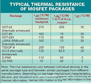 例如,采用1平方英寸的銅片,D-Pak的ΘJAD-Pak可能是50°C/W。但如果銅片就設在封裝引腳下,ΘJA值將會加倍(參見表)。采用多個并聯(lián)MOSFET,ΘJA主要依賴于它所安裝的銅片面積。兩個元器件的等效ΘJA可能是只有一個元器件時的一半,除非銅片的面積加倍。就是說,增加并聯(lián)MOSFET而不同時增加銅片面積,將使RDS(ON)減半,但對ΘJA的改變小得多。
