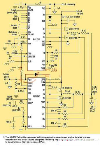 圖3所示CPU內(nèi)核電源在40A提供1.3V。兩個同樣的20A電源在300kHz運行,提供40A輸出電源。MAX1718主控制器驅(qū)動一個,而MAX1897從控制器驅(qū)動另一個。該電源輸入范圍在8~20V之間,指定封裝的最高工組作環(huán)境溫度60°C。