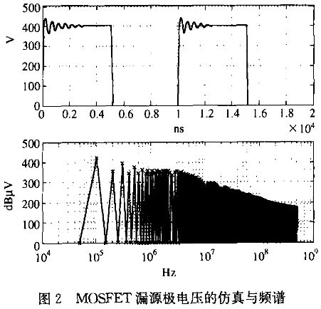 開關電源是目前用途非常廣泛的一種電源設備,然而隨著開關頻率以及開關速度的不斷提高,產生的電磁干擾越來越大,由于市場準入制度的實施,電磁干擾研究已引起了足夠的重視。干擾源是電磁干擾的三要素之一,是電磁干擾研究的重要部分,文獻[1~2]對干擾源進行了說明和描述,還有些學者對抑制干擾源發射的方法和干擾源的輻射進行了研究。本文從干擾源入手,對時域開關電壓信號進行電磁干擾特性研究,通過提取MOSFET時域電壓信號的特征參數,利用傅立葉變換(FFT)法,分析了開關信號電磁干擾的頻譜情況以及各參數對頻譜的影響,通過Matlab仿真證明了上述分析的正確性及工程實用性。由于FFT后頻域信號的幅值差別較大,難以研究,因此本文在FFT后,進行了對數變換,這樣既方便研究,又便于與實際進行對比。