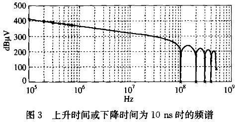 開關信號的上升和下降沿對干擾的幅值影響很大,圖3是上升時間或下降時間為10ns時的上升沿或下降沿的頻譜,把上升時間或下降時間改為100ns再仿真時發現:當上升時間或下降時間增加時,隨著頻率的升高,幅值減小的越快,也就是說,上升或下降時間的變化對高頻干擾幅值影響更大。表1中列出了上升時間或下降時間為10ns和100ns時,不同頻率的電磁干擾幅值和比較結果。從圖中還可以看出在頻率為