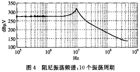 為了研究阻尼振蕩對電磁干擾的影響,本文同樣單獨對其進行了研究,圖4為其頻譜,