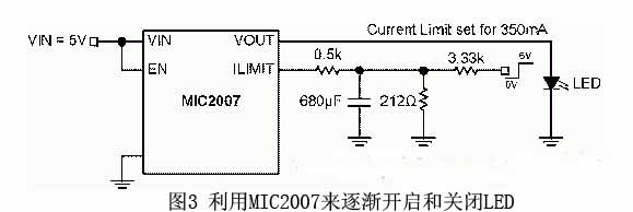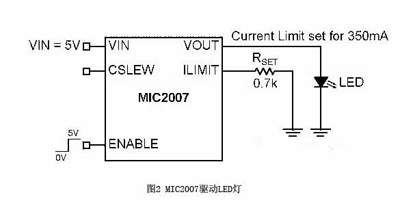 圖2展示的是輸出和LED相連的配電開關(guān)。MIC2007可以在2.5V-5.5V的輸入電壓下工作。它是通過外置電阻器Rset來設(shè)定限流值的。限流值等于CLF/Rset,CLF為限流因數(shù),一般是245(請參考MIC2007數(shù)據(jù)表暨電氣性能表),而Rset 則等于0.7 kΩ。因此,限流值就是245/0.7 kΩ = 350 mA。