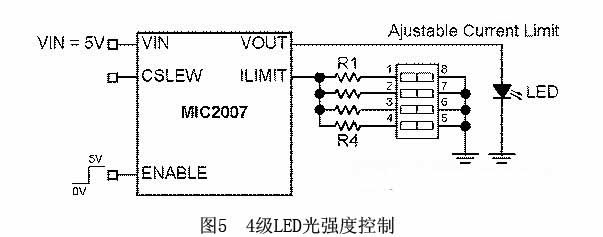 MIC2007可以在開關(guān)開啟且LED已點亮之后調(diào)節(jié)限流值。而通過改變限流值,就可以動態(tài)調(diào)節(jié)LED的光強度。如圖5所示,有4個電阻器連接到Ilimit管腳。