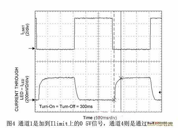 圖4中通道1是加到Ilimit上的0 5 V信號,而通道4則是通過LED的電流(Iled; 開啟時間= 關(guān)閉時間= 300 ms)。