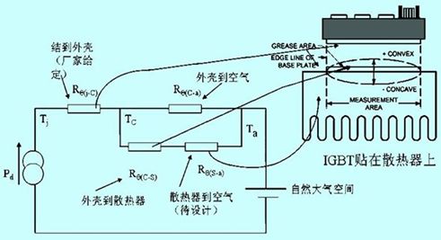 圖2中:rθ(j-c)是器件結到管殼基準點穩(wěn)態(tài)熱阻,由制造廠家提供,一般在數據表中給出上限值或給出瞬態(tài)熱阻曲線取t→∞的穩(wěn)態(tài)值;rθ(c-a)是管殼未通過散熱器直接到空氣的熱阻,通常不考慮;rθ(c-s)是管殼到散熱器的觸熱阻,通常由制造廠家在數據表中給出;rθ(c-a)是散熱器基準點到環(huán)境基準點的熱阻,其值由散熱器形式、尺寸和冷卻方式決定;ta是環(huán)境溫度。