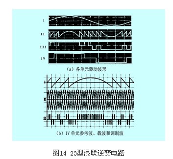 本方法主要針對非對稱混聯逆變電路。為了實現輸出電壓波形的連續調幅,需要對多電平電路進行pwm控制。同時為了降低脈沖階躍幅度帶來的電磁干擾,連續調幅時產生的脈沖不超過1v。圖14為23型3級h橋非對稱混聯逆變電路(三個級聯單元的直流電壓比為1:2:4)的混合pwm調制方法示意圖。首先對電壓為2v和4v單元按圖14(a)中的iii、iv波形進行驅動,然后將i中正弦調制波和iii、iv波形相減,得到1v單元的調制波ii。再用ii和三角載波進行調制,形成1v單元的pwm驅動波形,如圖14(b)所示。顯然,該法只對1v單元進行了pwm調制,因此在選擇器件時,就可以在2v和4v單元使用低頻大功率器件,如igct;而在1v的pwm單元采用高頻小功率器件。