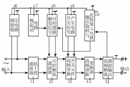 如圖1所示,它由抗干擾濾波器1、可控整流濾波器2、高頻變換開關元件3、高頻諧振變換器4、高頻整流濾波輸出5依次連接而成??煽卣鳛V波器2的導通角的控制由觸發信號控制邏輯8完成。慢起動電路7使觸發信號控制邏輯8在開機時的導通角由零度逐步上升。輸出取樣與比較放大電路10,將高頻整流濾波輸出5的輸出電壓與基準電壓源相比較且進行放大,從而控制觸發信號控制邏輯8,使輸出電壓穩定。改變基準電壓源的大小,就能改變觸發信號控制邏輯8的觸發導通角,從而調節輸出電壓的大小。開關信號產生電路9產生一個適合高頻諧振變換器4的方波信號,用來控制高頻變換開關元件3的導通和截止,使直流電能進入高頻諧振變換器4,形成高頻電流震蕩;并經高頻變壓器輸出至高頻整流濾波輸出5,減小了開關噪聲。輔助穩壓電源6給慢起動電路7、觸發信號控制邏輯8、開關信號產生電路9、輸出取樣與比較放大電路10提供能量和基準電。