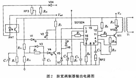 當負載過流時,經脈沖變壓器次級耦合,其初級也過流,流過R24的壓降增大,光耦PHT導通,SG1524的10腳電壓被抬高,SG1524關閉,無輸出電壓,從而保護電源。