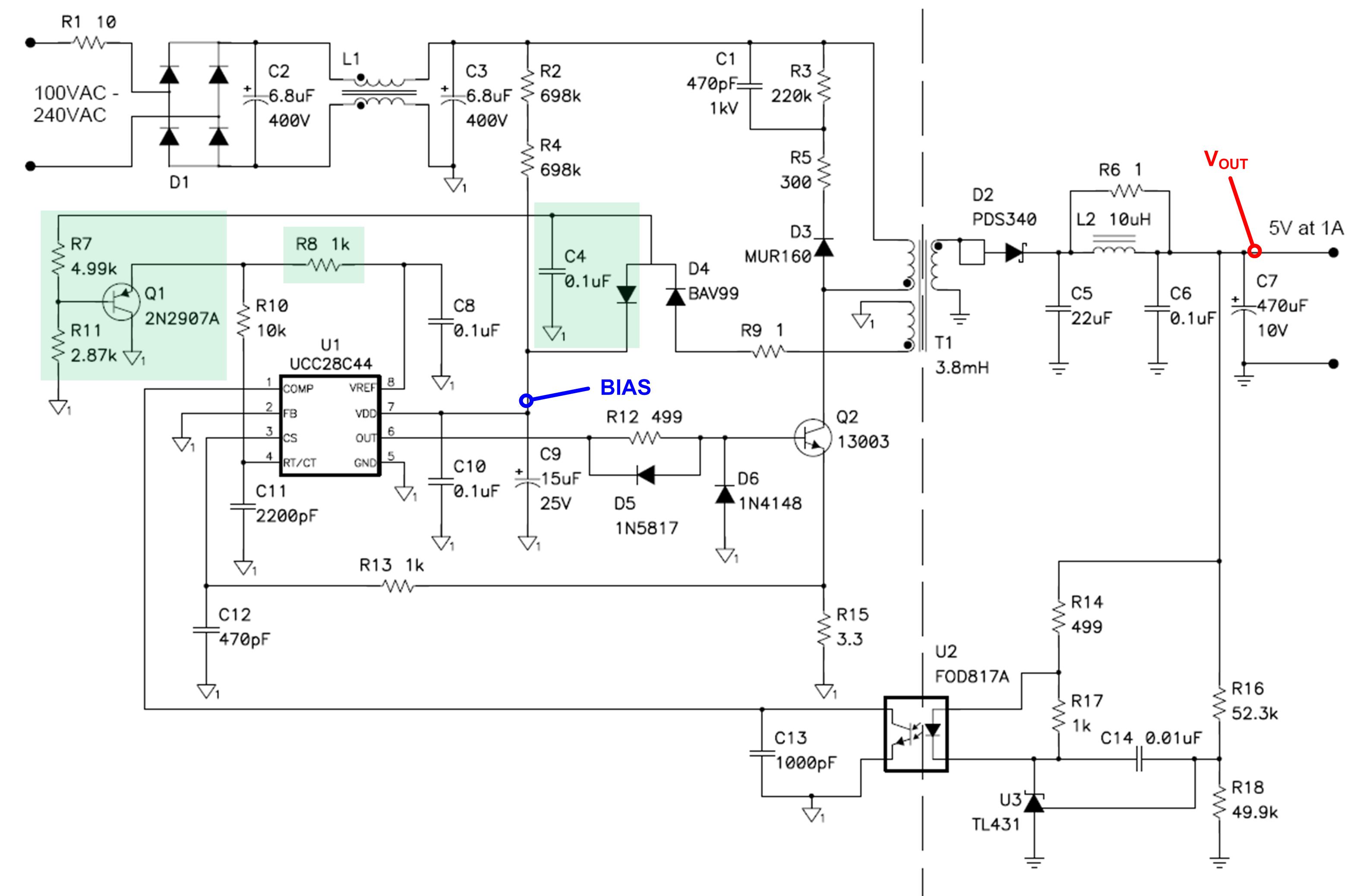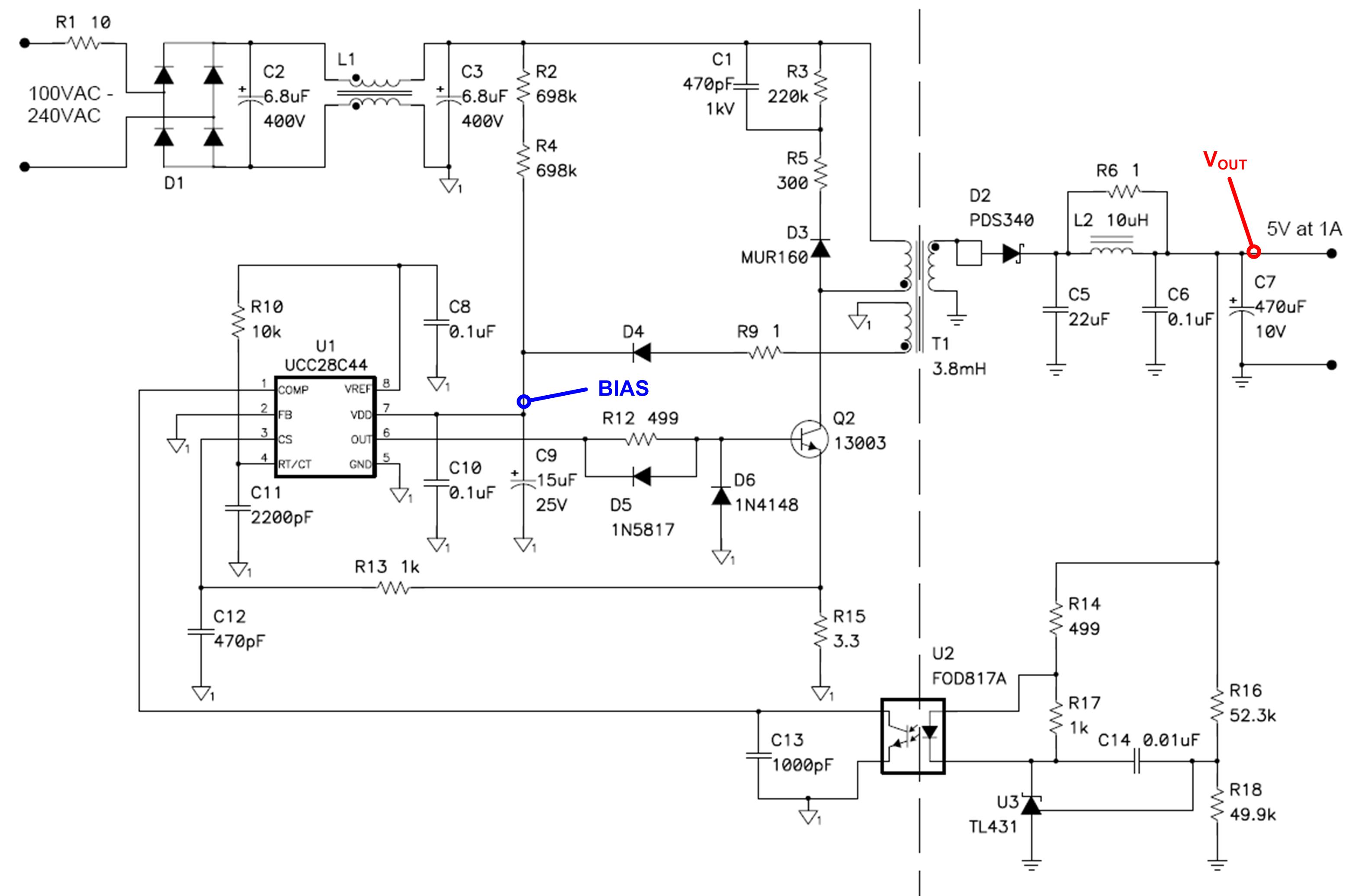 圖2顯示了移動設備充電器所使用的一個5V/5W非連續反向電源的原理圖。在范例中,我們使用了UCC28C44控制器,它是大多數經濟型峰值電流模式控制器的代表,擁有功率限制功能。在非連續反向結構中,如果忽略效率影響,可使用方程式1計算負載功率(P)的大小。