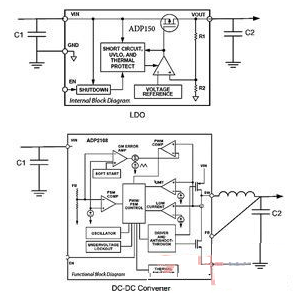 便攜式系統包含優化半導體工藝和工作電壓要求的多個集成電路。便攜式應用需要使用降壓調節器來調節IC采用比電池更低的工作電壓問題。當今最常用的調節器是低壓差(LDO)和降壓型開關調節器,如圖2所示。LDO由基準電壓源、誤差放大器、分壓器和傳輸管(pass transistor)組成。低壓差調節器只需使用兩個外部電容就能用較高直流電壓產生較低直流電壓,十分簡便。但是,當Vin遠高于Vout時,未輸送到負載的功率會以熱量形式損失。LDO效率約為(Vo/Vin)×100%.LDO效率將變得低下。