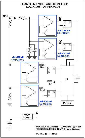 在這種情況下,DAC/比較器替代方案提供了幾個明顯優勢。需要4個DAC和4個比較器(或一片MAX516),后面連接一個4路設置/復位觸發器。一組DAC/比較器/FF監測高瞬態電壓,一組監測低瞬態電壓,一組用于監測電網跌落,一組用于監測浪涌(圖2)。瞬態電壓直接耦合到比較器,連接到電壓跌落和浪涌監測比較器的輸入首先要進行整流和濾波,以獲得電網電壓的平均值??稍谲浖姓{整到合適的rms.