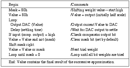 在逐次逼近ADC中,內部DAC的位模擬系列二進制重量,比較器輸出模擬天平指示。驅動權位處理的邏輯保存在封裝好的ADC的逐次逼近寄存器(SAR)或者控制DAC/比較器電路的處理器軟件子程序,該子程序可由不到20行的代碼來實現。