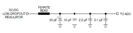 隔離來(lái)自ADC開(kāi)關(guān)噪聲的一個(gè)關(guān)鍵元件是電源濾波器,它包括一個(gè)鐵氧體磁環(huán)和旁路電容。在選擇鐵氧體磁環(huán)時(shí)應(yīng)考慮多個(gè)關(guān)鍵特性。首先,鐵氧體磁環(huán)必須有用于數(shù)據(jù)轉(zhuǎn)換器的充足額定電流,它必須有低的DCR(直流阻抗),以盡量減少磁環(huán)自身的壓降。例如,當(dāng)一個(gè)200mA電源通過(guò)一個(gè)DCR為1Ω的磁環(huán)時(shí),產(chǎn)生一個(gè)200mV的壓降。這個(gè)壓降可能將ADC上的電壓推至邊沿,考慮到電源電壓的標(biāo)準(zhǔn)差,ADC電壓甚至可能低于建議的工作電壓。