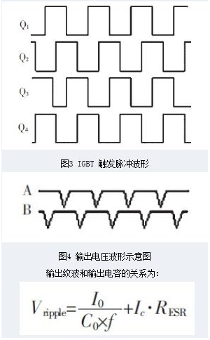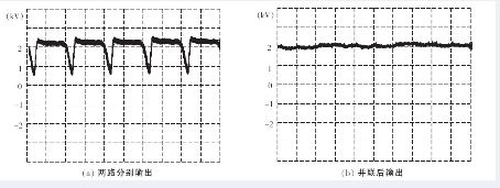 通過小功率試驗的驗證,證明了該方案的可行性,采用本方案可以在較低的工作頻率下達到輸出低紋波直流電壓的目的,可以減小半導體開關元件的損耗,提高元器件使用壽命和設備的穩定性,同時對控制等輔助電路的要求也降低;另外并聯后輸出電壓的脈動頻率高且幅值小,容易濾波,所以可以減小輸出端的濾波電容。由于電路是兩路電源并聯的結構,可以提高電源的輸出容量。
