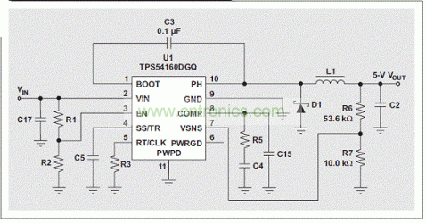 為了說明使用高開關(guān)頻率的權(quán)衡過程,我們設(shè)計(jì)了三個獨(dú)立電源,其工作頻率分別為100、300和750 kHz。所有這三種設(shè)計(jì),輸入電壓均為48V,輸出電壓均為5V,而輸出電流均為1A。這些要求常用于為一個5-V邏輯USB,或者為其它DC/DC轉(zhuǎn)換器使用的中頻通用5-V總線供電,例如:低壓降穩(wěn)壓器等。若想建立一些設(shè)計(jì)限制,所選允許紋波電壓需為50mV,其約為輸出電壓的1%;同時選擇使用0.5 A的峰至峰電感電流。德州儀器TPS54160是一種集成MOSFET的2.5-MHz、60-V、1.5-A降壓DC/DC轉(zhuǎn)換器,用作所有設(shè)計(jì)的穩(wěn)壓器。TPS54160特有外部補(bǔ)償和快速可編程頻率,適用于一些高輸入電壓的工業(yè)應(yīng)用。
