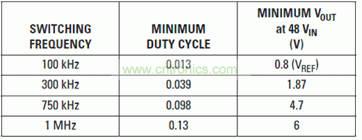 最小可控“導(dǎo)通”時間限制是DC/DC轉(zhuǎn)換器IC的一個特點(diǎn),其為脈寬調(diào)制(PWM)電路的最窄可達(dá)脈寬。在降壓轉(zhuǎn)換器中,開關(guān)周期期間功率MOSFET導(dǎo)通的時間百分比被稱作占空比,其等于輸出電壓與輸入電壓的比。使用TPS54160轉(zhuǎn)換器時,占空比為0.104(4 V/48 V),而數(shù)據(jù)表中列出的最小“導(dǎo)通”時間為130 ns。可控脈寬限制產(chǎn)生一個最小可達(dá)占空比,而用最小“導(dǎo)通”時間乘以開關(guān)頻率,我們可以輕松地計(jì)算出該占空比的大小。一旦知道了最小占空比,利用VIN乘以最小占空比,我們便可以計(jì)算出最低可達(dá)輸出電壓。最低輸出電壓同樣也受轉(zhuǎn)換器基準(zhǔn)電壓的限制,使用TPS54160時其為0.8V。