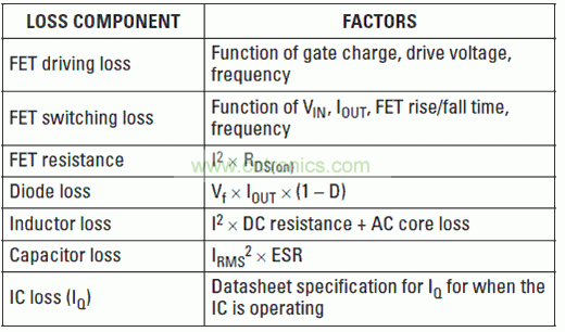 DC/DC轉(zhuǎn)換器的效率,是進(jìn)行電源設(shè)計(jì)時需要考慮的最重要屬性之一。低效率會轉(zhuǎn)換成高功耗,必須要在印刷電路板(PCB)上使用單獨(dú)的散熱器或者更多的銅,才能處理這些功耗。功耗也對電源上游器件提出了更高的要求。如表3所示,功耗共有幾個組成部分。