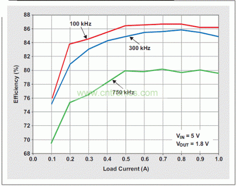 三個例子的重要損耗組成部分,來自于FET驅(qū)動損耗、FET開關(guān)損耗和電感損耗。FET電阻和IC損耗是一致的,因?yàn)樗腥齻€設(shè)計(jì)中都使用了相同的IC。由于所有例子中都選擇了低ESR的陶瓷電容,因此電容損耗可以忽略不計(jì)。為了表明高頻開關(guān)的影響,我們對每個例子的效率都進(jìn)行了測量,并將其顯示在圖2中。該圖清楚地表明,效率隨開關(guān)頻率增加而下降。若想提高所有頻率下的效率,需要尋找到一種全負(fù)載狀態(tài)下低漏到源“導(dǎo)通”電阻、低門電荷或者低靜態(tài)電流規(guī)范的DC/DC轉(zhuǎn)換器;或者尋找到一些具有更低等效電阻的電容和電感。