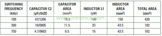 表4列出了三種設(shè)計(jì)要求的總電路板面積,以及電容和電感的焊盤面積。電容或者電感的建議焊盤面積,稍稍大于單個組件本身,且三種設(shè)計(jì)舉例均使用了該面積。每個組件占用的面積相加(其包括IC、濾波器以及所有其它小型電阻器和電容的焊盤尺寸),然后將得到的結(jié)果乘以2倍(考慮到組件的間距),便得到總面積。100-kHz和750-kHz設(shè)計(jì)之間存在近250 mm2的總面積節(jié)省,從而使濾波器體積縮小50%,而板空間占用減少55%。但是,存在收益遞減規(guī)律,因?yàn)殡娙莺碗姼兄禑o法減少至零!換句話說,不斷推高頻率并不能夠一直減小總尺寸,因?yàn)槟銦o法總是能夠在市場上買到這些尺寸適合且批量生產(chǎn)的電感和電容。注意,33-µH和15-µH電感占用相同的面積。存在這種可能性,是因?yàn)?3-µH電感的高度為3.5 mm,而15-µH電感僅高2.4 mm。我們想通過這兩種電感來說明的觀點(diǎn)是:電感與體積成正比例關(guān)系。