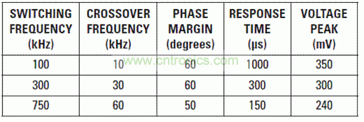 瞬態(tài)響應(yīng)是電源性能級別的一個較好指標(biāo)。我們利用每種電源的波特圖來表明高開關(guān)頻率的對比情況(參見圖3)。如圖所示,每個電源的相位裕度在45°和55°之間,其表明瞬態(tài)響應(yīng)得到較好的抑制。交叉頻率約為開關(guān)頻率的1/8。使用快速開關(guān)DC/DC轉(zhuǎn)換器時,設(shè)計(jì)人員應(yīng)確保電源IC誤差放大器具有足夠的帶寬來支持高交叉頻率。TPS54160誤差放大器的單位增益頻寬一般為2.7 MHz。表5顯示了實(shí)際瞬態(tài)響應(yīng)時間以及電壓峰值過沖的相關(guān)值。開關(guān)頻率越高,過沖值便越是更低,原因是更寬的帶寬。