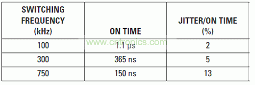 高轉(zhuǎn)換比和更高頻率時,會存在噪聲問題。當(dāng)選擇某個高開關(guān)頻率時,設(shè)計(jì)人員應(yīng)考慮抖動和DC/DC轉(zhuǎn)換器的最小“導(dǎo)通”時間。當(dāng)占空比較小時,抖動噪聲便為開關(guān)脈沖的更大百分比。表6顯示了48-V到5-V轉(zhuǎn)換比時,抖動與“導(dǎo)通”時間之比。我們假設(shè),在該相位節(jié)點(diǎn)上存在0.5-V二極管壓降和20-ns抖動。