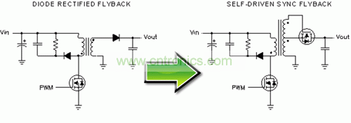 在自驅(qū)動(dòng)同步反向電源中,輸出二極管被一個(gè) N 通道 MOSFET 代替,同時(shí)必須向電源變壓器添加一個(gè)繞組以生成同步柵極驅(qū)動(dòng)信號(hào)。相比輸出二極管整流器,該同步MOSFET的低導(dǎo)通電阻可帶來更低的傳導(dǎo)損耗,這就極大地提高了高負(fù)載電流時(shí)的效率。