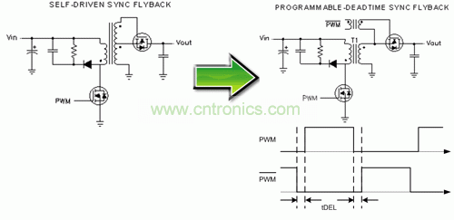 圖 3 顯示了一個(gè)具有可編程延遲的隔離柵極驅(qū)動(dòng)信號(hào)如何被添加到同步反向結(jié)構(gòu)中以消除直通損耗。通過柵極驅(qū)動(dòng)變壓器,可以實(shí)現(xiàn)隔離和電平變換。必須使用擁有較好驅(qū)動(dòng)輸出和可調(diào)節(jié)延遲的 PWM 控制器(例如:UCC2897),以便對(duì)一次側(cè)和二次側(cè)同步 MOSFET 進(jìn)行控制。延遲必須足夠長,以確保同步 MOSFET 能夠在一次側(cè) MOSFET 開啟以前被完全關(guān)閉。然而,延遲太長會(huì)引起一個(gè)或兩個(gè) MOSFET 上出現(xiàn)主體二極管傳導(dǎo),并導(dǎo)致過多的功率損耗。由于最佳停滯時(shí)間取決于一次側(cè)和二次側(cè) MOSFET 延遲時(shí)間、轉(zhuǎn)換速度、電源變壓器漏電感以及柵極驅(qū)動(dòng)電路,因此可調(diào)節(jié)延遲時(shí)間控制器對(duì)最小化損耗至關(guān)重要。
