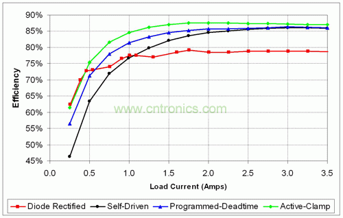 如果注重輕負(fù)載效率和成本最低化,那么依靠“簡單的”二極管整流反向電路來獲得效率提高則較為困難。如果您的要求沒有那么苛刻,那么選用自驅(qū)動(dòng)同步 MOSFET 驅(qū)動(dòng)便可以最低成本實(shí)現(xiàn)較大的效率增益。在使用 UCC2897 控制器的一次側(cè) MOSFET 和二次側(cè)同步 MOSFET 之間添加可編程?hào)艠O驅(qū)動(dòng)延遲,可以提高輕負(fù)載效率。利用有源鉗位電路,已被證實(shí)與典型的二極管整流反向轉(zhuǎn)換器相比,其可提高約 10% 的滿負(fù)載效率,而在輕負(fù)載時(shí)效率會(huì)有所下降。另一個(gè)好處是在整個(gè)滿輸出負(fù)載范圍內(nèi)都保持了“連續(xù)導(dǎo)電模式”,從而保持了卓越的輕負(fù)載瞬態(tài)性能。本文敘述的每一種電路改進(jìn)方法都可降低電路損耗,但都會(huì)帶來設(shè)計(jì)成本的增加。因此,請(qǐng)根據(jù)您的預(yù)算來決定您要達(dá)到的環(huán)保水平!