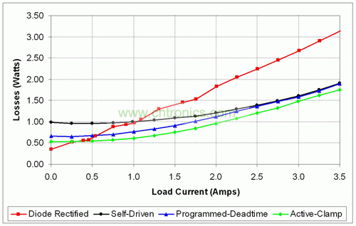 圖 6 顯示了每次二極管整流反向結(jié)構(gòu)升級(jí)對(duì)實(shí)際設(shè)計(jì)效率的提升程度。電源將一個(gè)遠(yuǎn)距通信 48VDC 輸入轉(zhuǎn)換為一個(gè) 3.5A 最大負(fù)載電流的 3.3V 輸出。將一個(gè)二極管整流器轉(zhuǎn)換為一個(gè)自驅(qū)動(dòng)同步反向結(jié)構(gòu)使最大負(fù)載效率提高超過 7%,但也確實(shí)降低了 1A 以下輸出電流的輕負(fù)載效率。這是由于同步 MOSFET 帶來了柵極驅(qū)動(dòng)損耗、開關(guān)損耗和直通損耗。如圖 7 所示,輕負(fù)載狀態(tài)下這些損耗在總損耗中占較大百分比,從而降低了輕負(fù)載的效率。使用可編程延遲消除了直通損耗,從而極大地提高了輕負(fù)載的效率,如圖 7 所示。由于其他電路損耗在同步 MOSFET 損耗中占主導(dǎo)地位,因此滿負(fù)載效率保持基本不變。最終,有源鉗位的實(shí)施提高了所有負(fù)載條件下 3.3V 電源的效率。