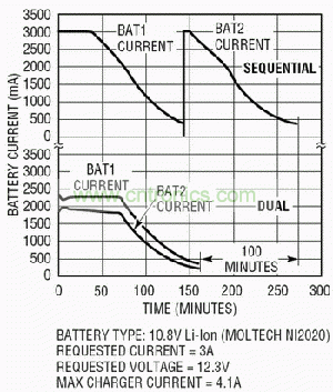 傳統(tǒng)上,雙電池系統(tǒng)是順序放電系統(tǒng),允許順序消耗電池電量(先消耗電池1,再消耗電池2),以簡單地延長總的電池工作時間。LTC1760采用了專有模擬控制技術(shù),可允許安全地對兩個電池并行充電或放電。圖1是一個采用LTC1760的雙電池系統(tǒng)的簡化原理圖。這種結(jié)構(gòu)使充電速度提高了50%,電池工作時間延長了10%。此外,并行放電不僅增強(qiáng)了電流能力,而且還降低了I2R損耗并改善了在極高負(fù)載條件下的電壓調(diào)節(jié)能力。降低I2R損耗和改善電壓調(diào)節(jié)都延長了時序解決方案的總放電時間(見圖2)。
