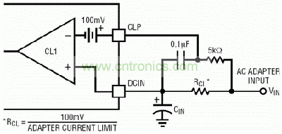 如圖4所示,這個電路限制充電電流以防止系統(tǒng)功率升高時交流適配器過載。要設(shè)定輸入電流限制,最重要的就是要最小化墻式配適器的額定電流。限流電阻可以通過下兩式來計算。