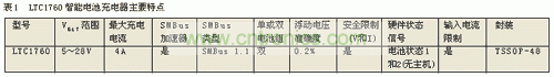 LTC1760是一個高度集成的三級電池充電器和選擇器,用于使用雙智能電池的產(chǎn)品。它是一個降壓開關(guān)拓?fù)潆姵爻潆娖鳎哂蟹现悄茈姵貥?biāo)準(zhǔn)定義的多種功能和其他新增功能,如輸入限流和安全限制,等等。三個SMBus接口使LTC1760能實現(xiàn)諸如跟蹤兩個電池的內(nèi)部電壓和電流之類的伺服功能,并允許一個SMBus主機(jī)監(jiān)視任一電池的狀態(tài)。這種伺服技術(shù)能使充電器的準(zhǔn)確度同電池內(nèi)部電壓和電流測量值只有±0.2%的誤差。