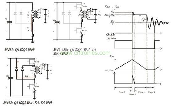雙管反激與單管反激的基本原理相似,只是多了一個階段2。階段1、3、4與零諧振單管反激的工作原理相同。階段1: Q1和Q2同時導通,變壓器的電感電流將會線性增加并將能量儲存于變壓器中;當2個MOS管關閉時候就進入階段2;階段2:因為漏感所形成的高漏源電壓會導致2個回收二極體導通,Q1和Q2截止,D1,D2導通;當漏感能量回收完畢,進入階段3;階段 3和4: Q1和Q2 截止,D1和D2截止。