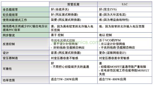 表1 雙管反激與LLC諧振轉換器特性比較