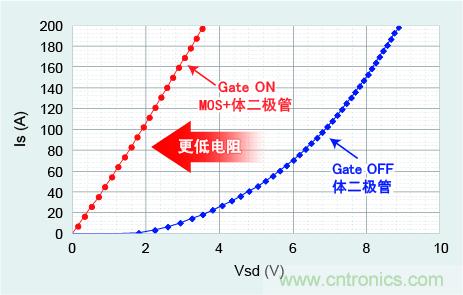 一般Si-IGBT元件無法逆向?qū)?,而SiC-MOSFET可通過體二極管實(shí)現(xiàn)常時(shí)逆向?qū)?。另外,通過輸入柵極信號,還可實(shí)現(xiàn)MOSFET的逆向?qū)?,與二極管相比,可實(shí)現(xiàn)更低電阻。通過這些逆向?qū)ㄌ匦?,與二極管整流方式相比,可在1000V以上的范圍采用高效同步整流方式的技術(shù)。