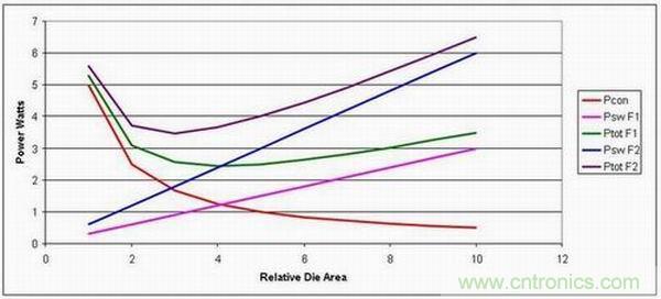但是,在更高的工作頻率下,最佳裸片面積較小,從而帶來(lái)成本節(jié)約。實(shí)際上,在低頻率下,通過(guò)調(diào)整裸片面積來(lái)最小化損耗會(huì)帶來(lái)極高成本的設(shè)計(jì)。但是,轉(zhuǎn)到更高工作頻率后,我們就可以優(yōu)化裸片面積來(lái)降低損耗,從而縮小電源的半導(dǎo)體體積。這樣做的缺點(diǎn)是,如果我們不改進(jìn)半導(dǎo)體技術(shù),那么電源效率將會(huì)降低。
