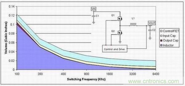圖1顯示的是降壓電源頻率與體積的關(guān)系。頻率為100 kHz時(shí),電感占據(jù)了電源體積的大部分(深藍(lán)色區(qū)域)。如果我們假設(shè)電感體積與其能量相關(guān),那么其體積縮小將與頻率成正比例關(guān)系。由于某種頻率下電感的磁芯損耗會(huì)極大增高并限制尺寸的進(jìn)一步縮小,因此在此情況下上述假設(shè)就不容樂(lè)觀了。如果該設(shè)計(jì)使用陶瓷電容,那么輸出電容體積(褐色區(qū)域)便會(huì)隨頻率縮小,即所需電容降低。另一方面,之所以通常會(huì)選用輸入電容,是因?yàn)槠渚哂屑y波電流額定值。該額定值不會(huì)隨頻率而明顯變化,因此其體積(黃色區(qū)域)往往可以保持恒定。另外,電源的半導(dǎo)體部分不會(huì)隨頻率而變化。這樣,由于低頻開(kāi)關(guān),無(wú)源器件會(huì)占據(jù)電源體積的大部分。當(dāng)我們轉(zhuǎn)到高工作頻率時(shí),半導(dǎo)體(即半導(dǎo)體體積,淡藍(lán)色區(qū)域)開(kāi)始占據(jù)較大的空間比例。