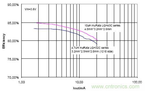 圖 10 顯示整個(gè)鋰離子電池電壓范圍(2.7V~4.2V)內(nèi)均可以實(shí)現(xiàn) 80% 以上的效率。在此應(yīng)用中,使用了一個(gè)高度僅為 1.2mm 的電感 (Sumida CMD4D11-4R7, 3.5mm*5.3mm*1.2mm)。 從圖 10 中的效率曲線可以看出:在大多數(shù)應(yīng)用中,升壓轉(zhuǎn)換器可以實(shí)現(xiàn)比充電泵解決方案更高的效率。但是,在無(wú)線應(yīng)用中使用升壓轉(zhuǎn)換器或充電泵時(shí)還需要考慮 EMI 問(wèn)題。