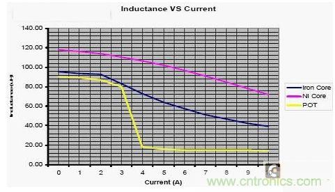 下圖為三種不同的磁芯,其電感量隨電流的變化的曲線。從圖5 中可以看出:在設計汽車音響直流電源濾波器時,要根據工作電流的范圍來選擇合適的扼流圈。當汽車音響的正常工作電流大于3A 時,若選擇圖中POT 磁芯的扼流圈,電感量急劇降低,根本起不到濾波器的效果。