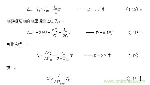 同理,(1-17)和(1-18)式的計(jì)算結(jié)果,只給出了計(jì)算串聯(lián)式開(kāi)關(guān)電源儲(chǔ)能濾波電容C的中間值,或平均值,由于輸出電流的不確定性,實(shí)際應(yīng)用時(shí),可以以此為極限,在此平均值的計(jì)算結(jié)果上再乘以一個(gè)大于1的系數(shù)。