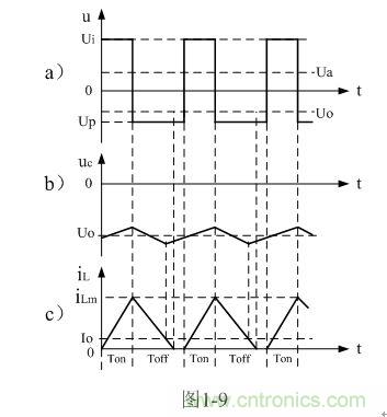 圖1-8、圖1-9、圖1-10分別是控制開(kāi)關(guān)K的占空比D等于0.5、< 0.5、> 0.5時(shí),圖1-7電路中幾個(gè)關(guān)鍵點(diǎn)的電壓和電流波形。圖1-8-a)、圖1-9-a)、圖1-10-a)分別為控制開(kāi)關(guān)K輸出電壓uo的波形;圖1-8-b)、圖1-9-b)、圖1-10-b)分別為儲(chǔ)能濾波電容兩端電壓uc的波形;圖1-8-c)、圖1-9-c)、圖1-10-c)分別為流過(guò)儲(chǔ)能電感L電流iL的波形。應(yīng)該特別注意的是,圖1-8-c)、圖1-9-c)、圖1-10-c)中的電流波形按原理應(yīng)該取負(fù)值,但取負(fù)值后反而覺(jué)得與前面圖1-5與圖1-6不好對(duì)比和分析,因此,當(dāng)進(jìn)行具體計(jì)算時(shí),一定要注意電流和電壓的方向。